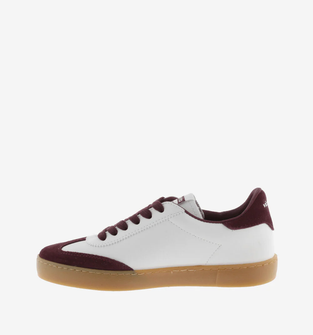 White and burgundy trainers made in Spain from leather-effect material with suede panels. Tonal lace-up fastening and new cyclist-style toe design. The translucent caramel-coloured sole adds a retro touch. They also feature a more ergonomic insole, made from recycled materials, providing superior comfort with every step.