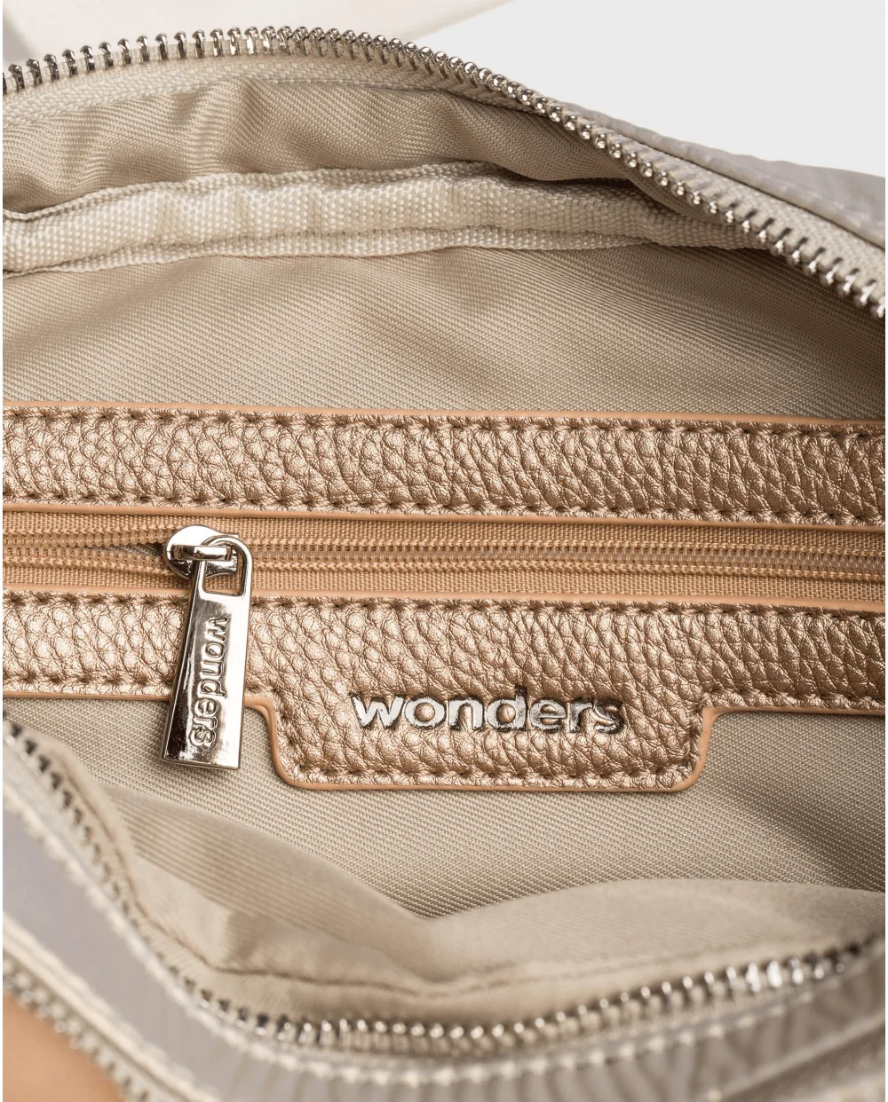 The CLOUD women’s bag, crafted in gold textile, boasts a medium rectangular design for practicality and elegance. Features include a metallic ""W"" detail on the front, a front pocket, a back pocket, and two central compartments, all secured with zippers for extra safety. The adjustable strap with Wonders branding makes it the perfect accessory to pair with your Wonders shoes. Dimensions: 24x17x8 cm.