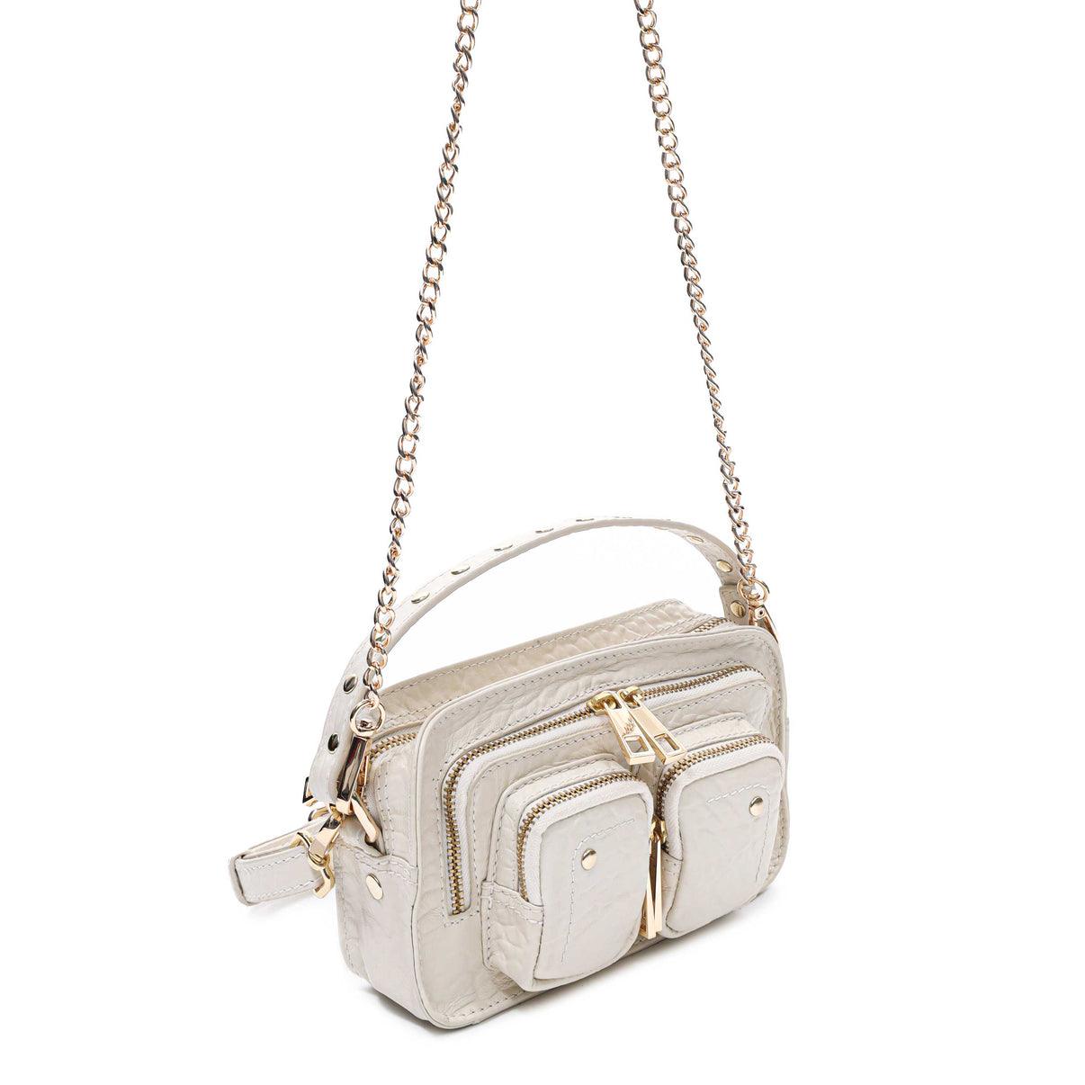 The Helena bag has a main compartment with an inner pocket. In addition, the bag has three small compartments on the front, which close with a zip. The bag comes with an adjustable leather strap and a chain. The bag has gold details.
