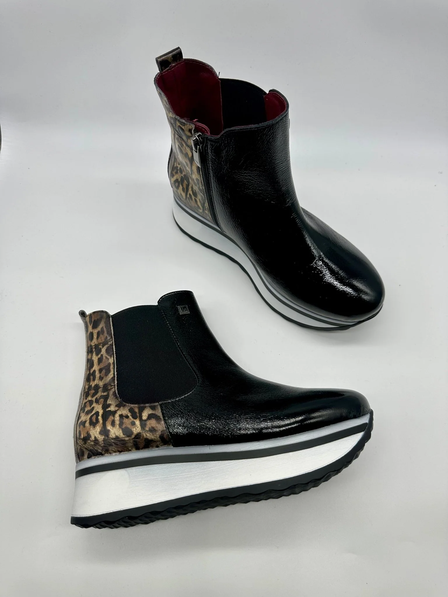 Sleek and ultra-comfortable, these Jose Saenz platform ankle boots blend black patent leather with a leopard print trim . A lightweight 5 cm wedge adds easy lift with inner side zip for easy access, while the removable cushioned insole and soft leather lining keep you comfortable from local stroll to city breaks !Â