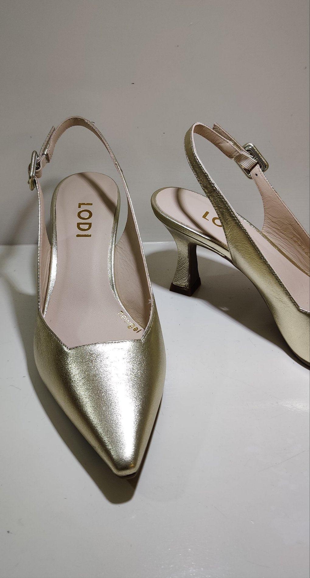 JUCO women's open-heel pumps from the LODI brand in gold metallic leather. V-cut on the side and 7 cm geometric heel. Leather interior and buckle closure. Square neckline. A basic that goes with your most beautiful outfits. They have new gel soles for better comfort with each step. Spanish manufacturing.