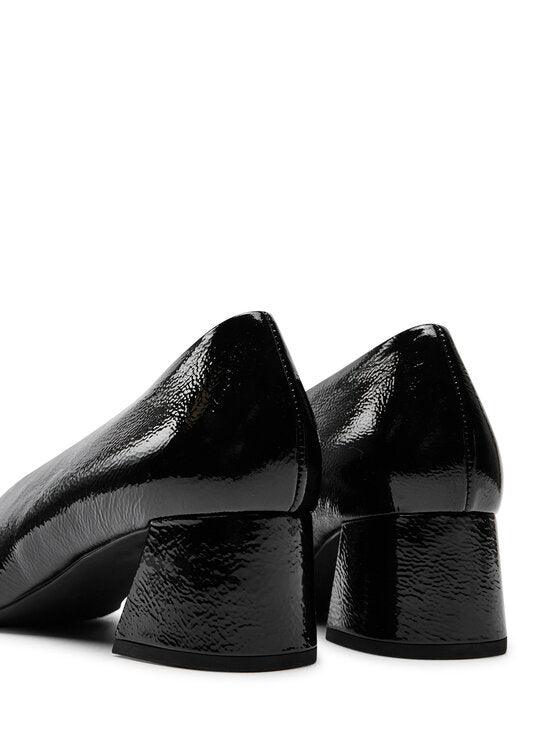 - Pointed-toe, sustainable black patent leather pumps