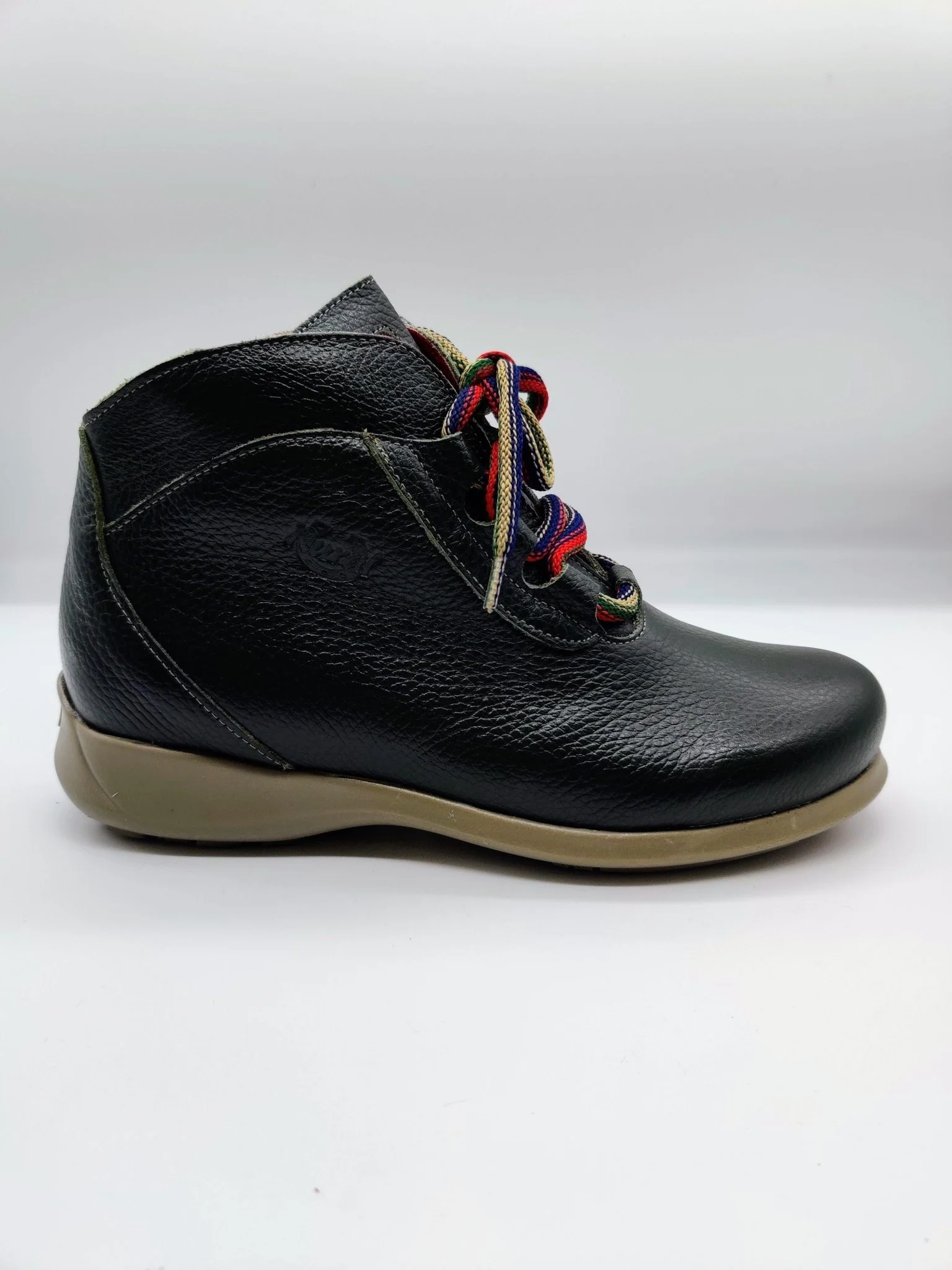 Extremely soft natural leather upper. Green leather lace-up boot with multicoloured laces .