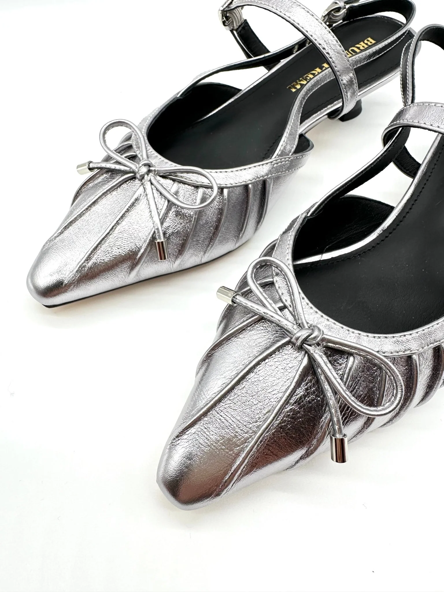 The Tia Bom slingbacks will not go unnoticed. These slightly inclined 4cm heel slingbacks in pewter metallic with romantic bow and adjustable straps for a secure fit will elevate any outfit.Â