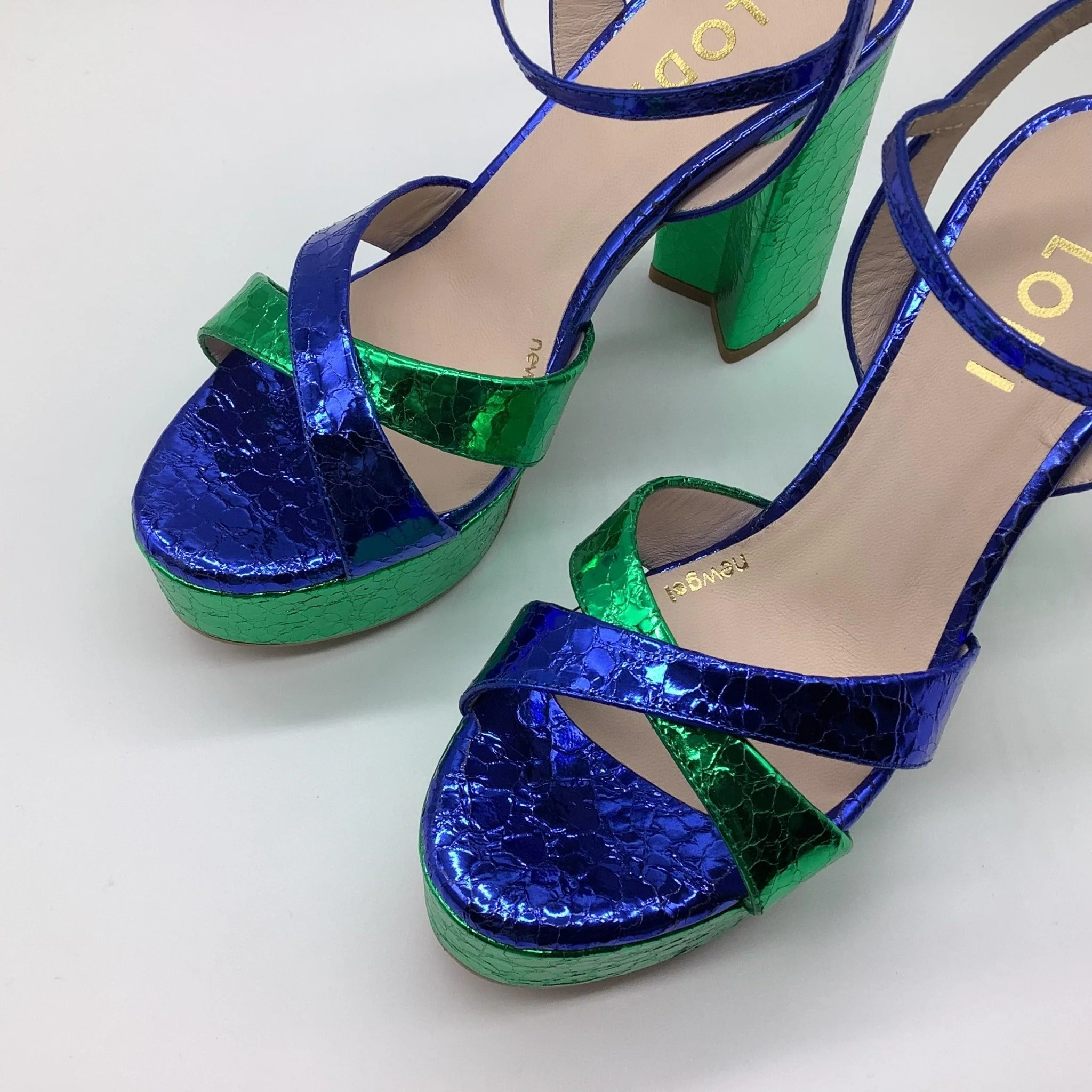 LODI women´s platform TISTER sandals in green and blue metallic coloured leather. A design made with a heel, 11 cm in height, and a 4 cm platform. Side buckle closure with ankle strap. The TISTER sandal will be a perfect addition to any type of event. Includes a new gel bottom for improved comfort in every step. Made in Spain.