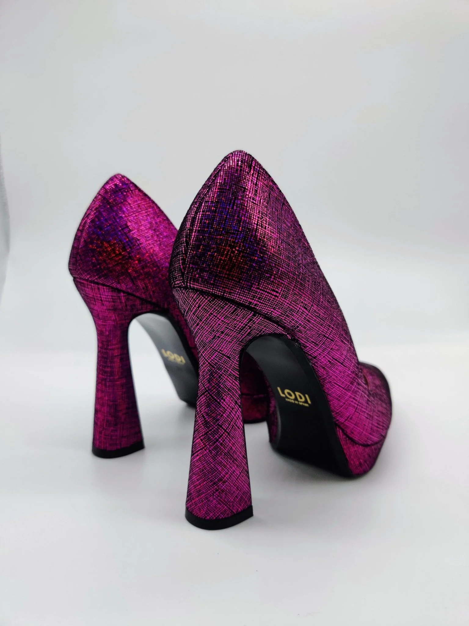 WANIS by LODI women´s pumps in blue metallic fabric. The design features an 11.5 cm geometric heel and a 2.5 cm platform. Leather-lined interior. V-throat. Including a new gel sole for comfort in every step. Made in Spain.